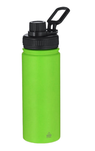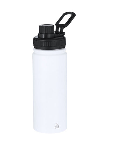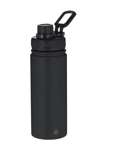 Bidón de Acero Inox Reciclado con 550 ml de capacidad. Incluye tapadera color negro con sistema de cierre a rosca, agarre de silicona para un óptimo sellado, dosificador y asa para transporte ajustable. En acabado mate especialmente diseñado para láser. Incluye distintivo Acero Inox Reciclado.