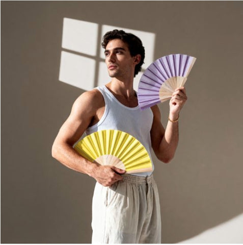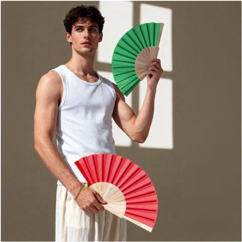 Abanico de 23 cm de altura fabricado en madera natural y poliéster.