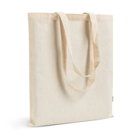 Bolsa de compras de algodón reciclado 140g/m², compuesta por 70% algodón reciclado y 30% RPET (plástico reciclado), con dimensiones de 38×42 cm. Resistente y espaciosa, esta bolsa es ideal para el día a día — desde las compras del supermercado hasta el transporte de documentos o accesorios. Su diseño simple y moderno se adapta a cualquier estilo, mientras que el material reciclado refuerza el compromiso con la sostenibilidad. Una elección práctica, elegante y respetuosa con el medio ambiente.