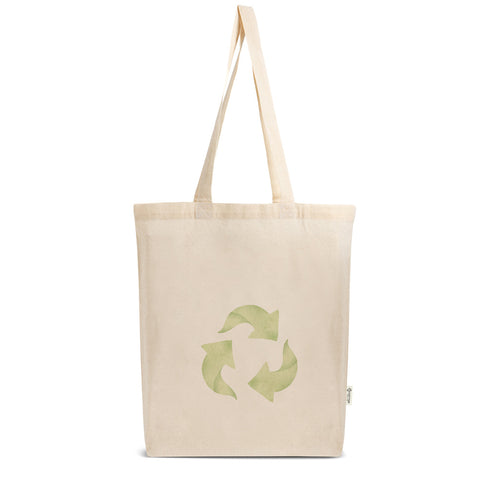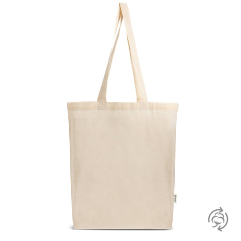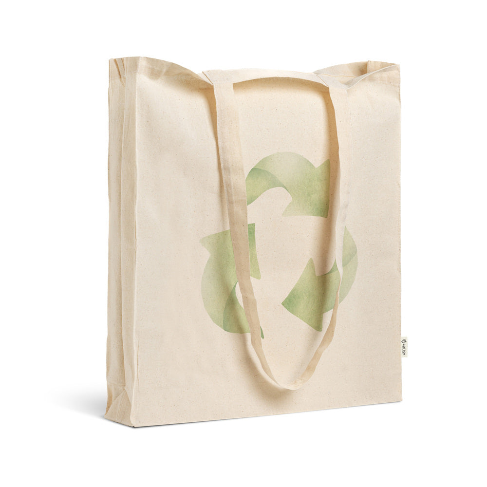 Bolsa de algodón reciclado 140g/m² con fuelle total, compuesta por 70% algodón reciclado y 30% RPET (plástico reciclado), con dimensiones de 38×42x8cm. Esta bolsa es una elección práctica y consciente para el día a día, combinando sostenibilidad, resistencia y estilo. Su diseño con fuelle total ofrece mayor capacidad y estabilidad, lo que la hace ideal para transportar libros, compras u objetos personales.