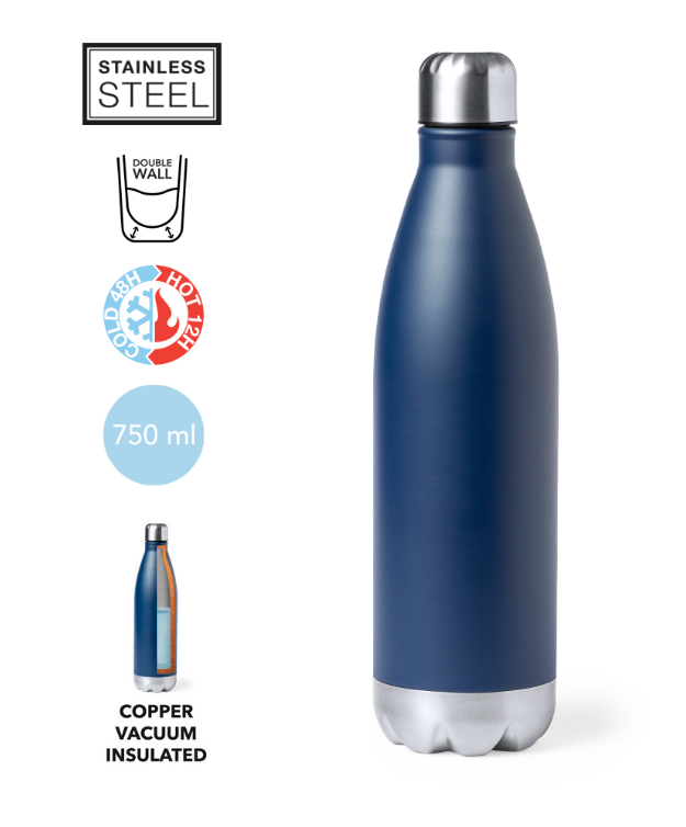 Bidón térmico de 750 ml de capacidad, fabricado en acero inox de doble pared. Con aislamiento de cobre al vacío, que permite mantener el calor y el frío durante más tiempo, llegando a las 12 y 48 horas respectivamente. Tapón a rosca, libre de BPA y con base a juego. Disponible en variada gama de colores metalizados y presentado en caja individual de diseño kraft.