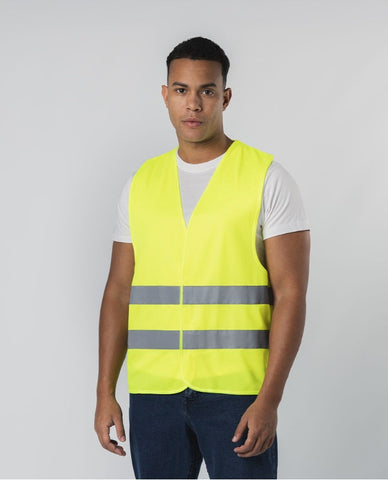 Chaleco reflectante de alta visibilidad, homologado según normativas de seguridad CE. Con doble tira reflectante alrededor del cuerpo y cierres de velcro. Talla única para adulto.