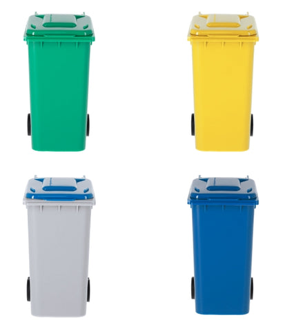 Lapicero con ruedas en forma de contenedor con tapa, disponible en varios colores. Perfecto para merchandising y totalmente personalizable en Ecobarna.