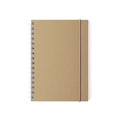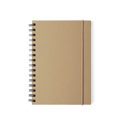 Libreta con anillas de color en línea nature. Con tapas rígidas en cartón reciclado y elástico de cierre en colores naturales. Con 80 hojas de disposición a una raya y diseño eco.