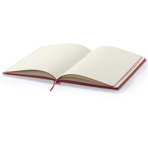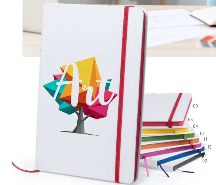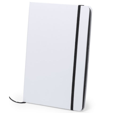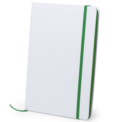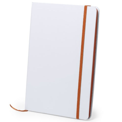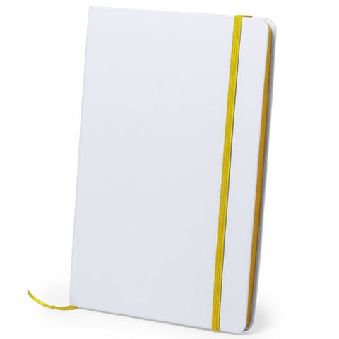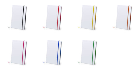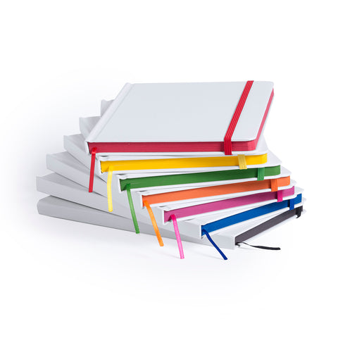 Bloc de notas con tapas rígidas de suave tacto acabadas en color blanco. De 100 hojas lisas con lomo en divertidos colores, elástico de sujeción y marcapáginas de tela a juego.