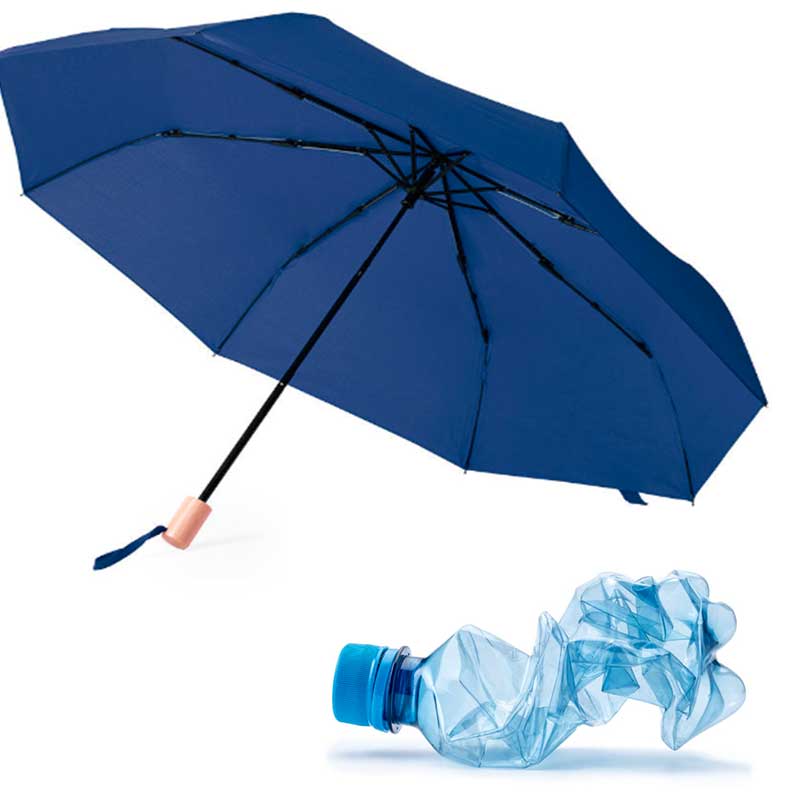 Paraguas plegable de línea nature de 95cm de diámetro. En material pongee 190T RPET, elaborado a partir de plástico reciclado, para así fomentar la reutilización de residuos plásticos y ayudar a la sostenibilidad del planeta. De apertura manual, con sistema anti viento y varillas metálicas. Mango de madera, con funda de transporte y cintas a juego. Con etiqueta distintiva RPET