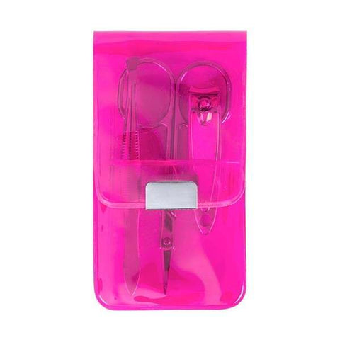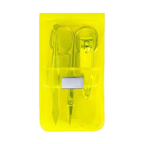 Set de manicura de 3 accesorios de acero inox en resistente estuche de PVC de acabado transparente en vivos colores. Con tijeras, pinzas y cortaúñas con lima. Fundas interiores para accesorios y cierre de corchete. Totalmente desplegable para fácil marcaje.